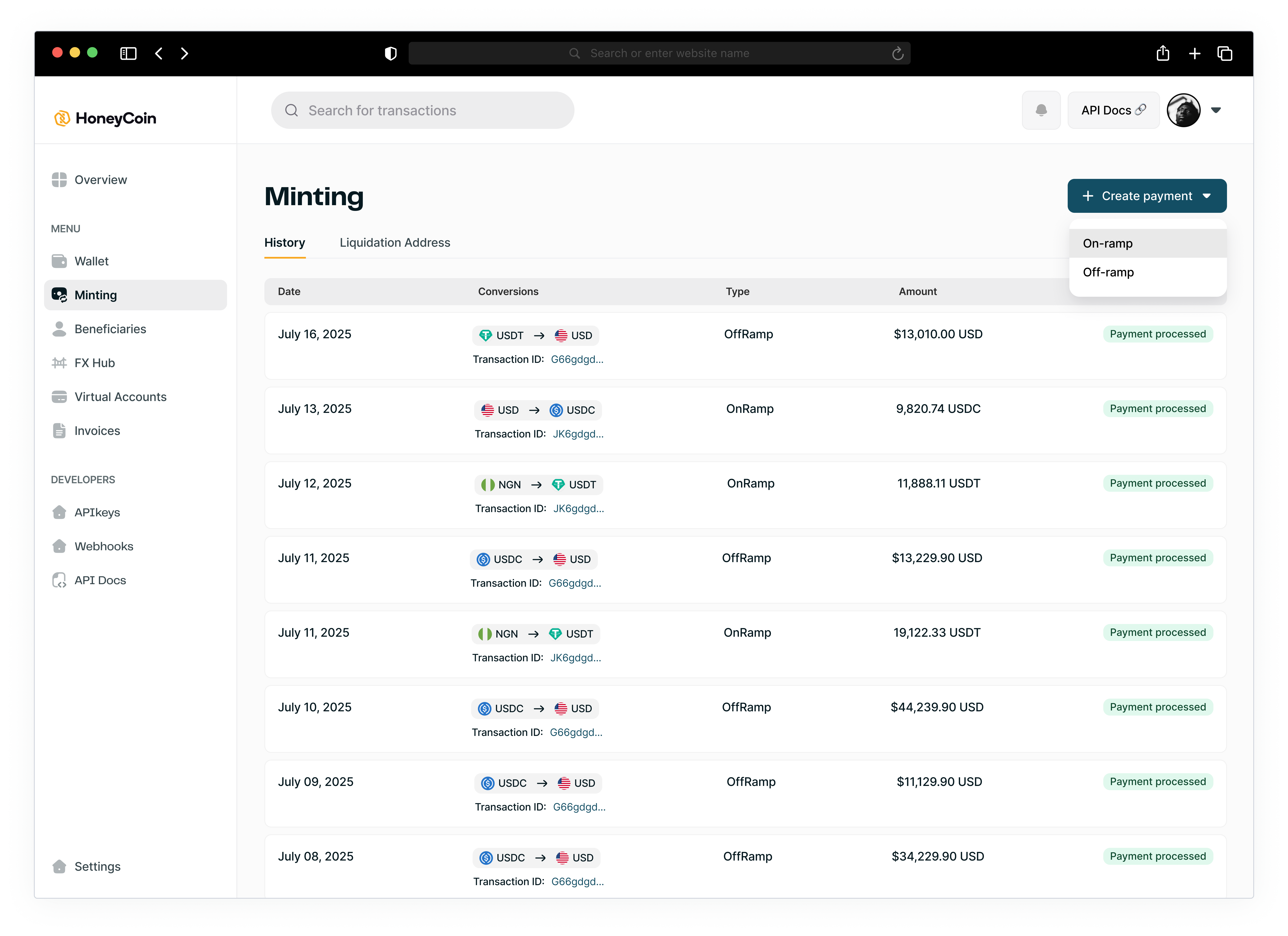 HoneyCoin allows your business to enable USDT minting for your customers while giving you control over pricing.
